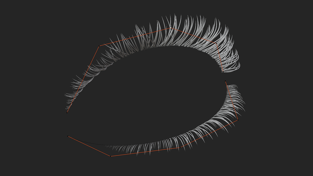 Eyelashes. generated using Blender's Geometry Node and controlled using Curve Deform Modifier for Blender version 3.1 or above.